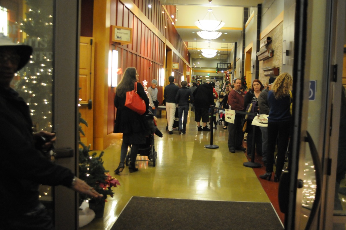 Seasonal Christmas music and chatter filled the Community Center afterwards, as the mayor invited crowds to enjoy complimentary hot chocolate, cookies and donuts next door — and a long line quickly assembled for photos with Saint Nick.