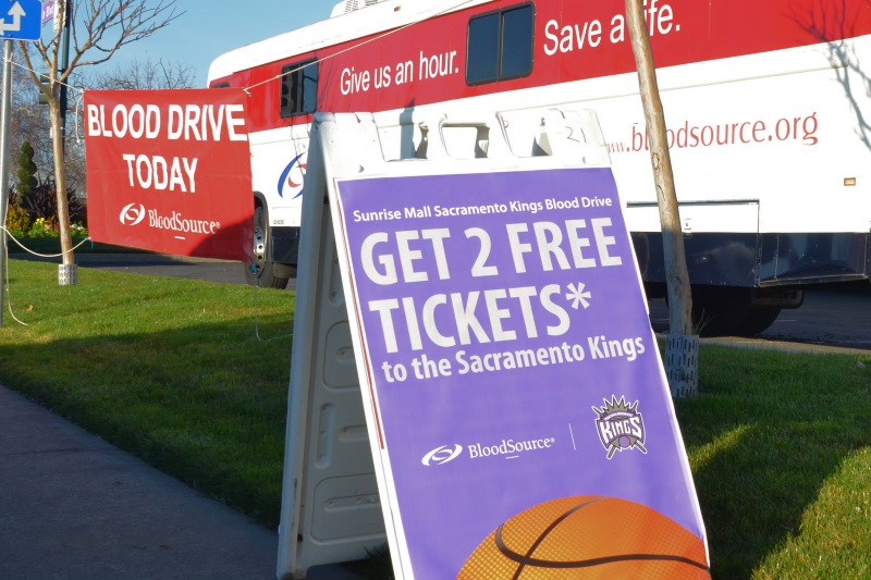 Over the weekend, local blood donors were able to pick up a pair of free tickets to a Sacramento Kings game in exchange for giving a pint of blood at one of the “bloodmobile” stations in the Sunrise Mall parking lot.