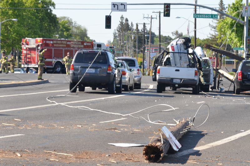 With a severed power pole and dangling wires in the street, all directions of traffic at Greenback Lane and San Juan Avenue were shut down for several hours Friday morning, due to a collision involving several vehicles, an electrical pole and a big rig.