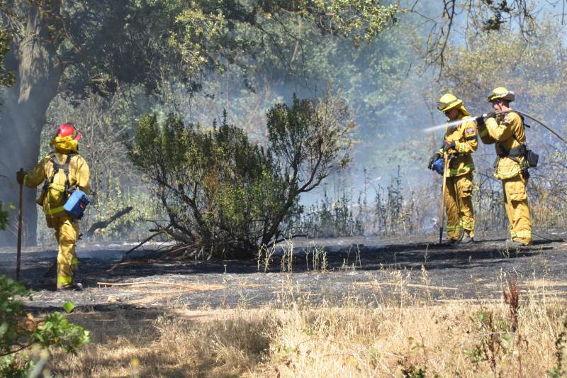 Eidem said at least 15 firefighters and multiple helicopter water drops were utilized to battle the brush blaze, with crews containing it by 3:05 p.m., after receiving a call just after 2:30 p.m.