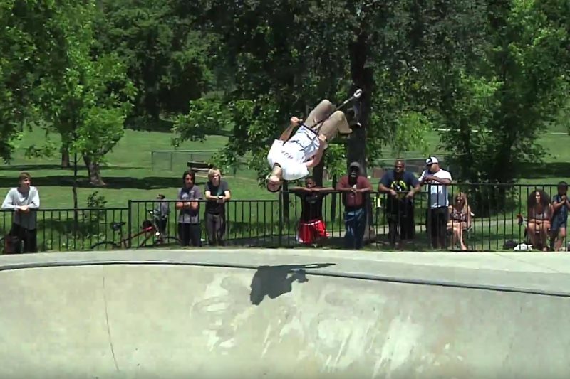Scooter riders executing 360-degree spins, a backflip, and falls on the asphalt are showcased in a new video uploaded to YouTube this week, filmed during the 2015 scooter competition at Rusch Park by an extreme sports video team.