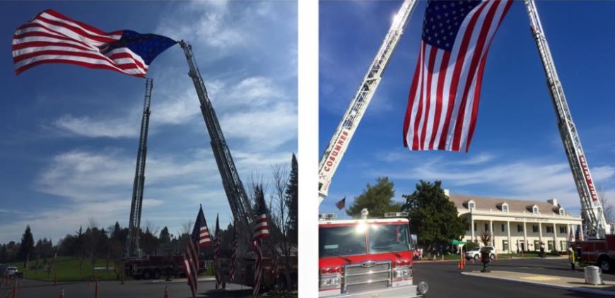 In honor of President’s Day, Citrus Heights-based Metro Fire Truck 23 joined with another ladder truck to fly a large American flag outside Mount Vernon Memorial Park on Greenback Lane, Monday.