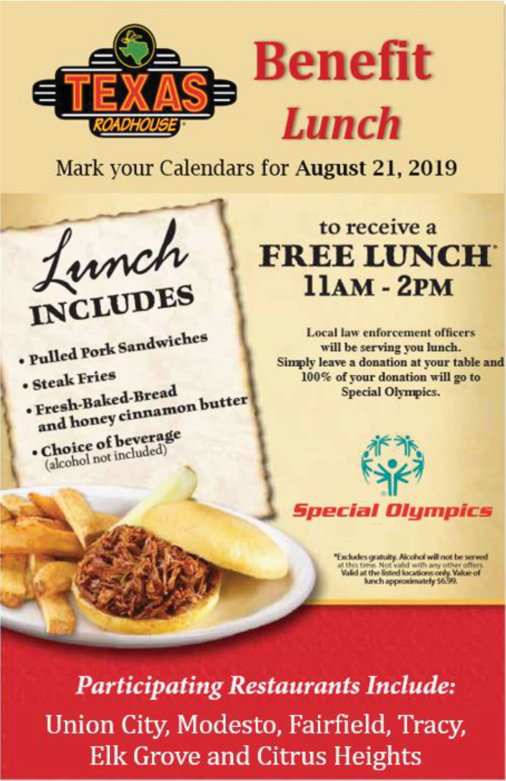 Texas Roadhouse at 6309 Sunrise Blvd. is hosting a benefit lunch for Special Olympics on Wednesday, Aug. 21, from 11 a.m. to 2 p.m.