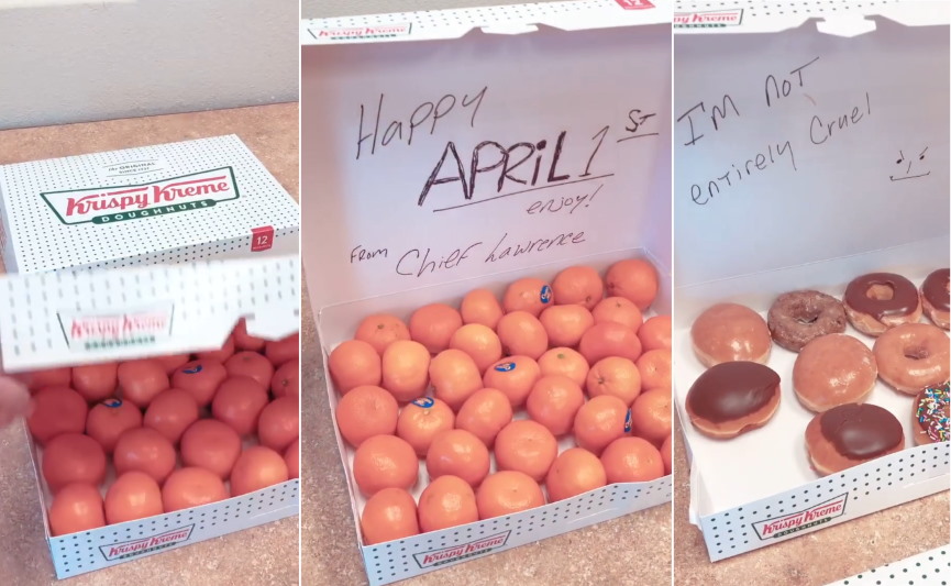 The department posted a short video about the prank on social media, revealing the box had been stuffed with orange Cuties fruit instead of donuts. A hand-written message inside the box said “Happy April 1st, from Chief Lawrence,” along with “enjoy!”