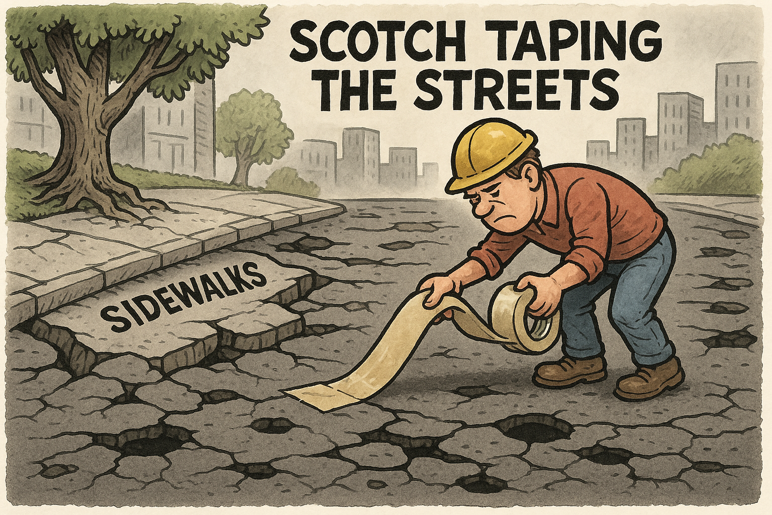 Over 20 years ago, the city spent much time and money on what was called “Walk-a-bility’ study’s. Then nothing was done about it. Sidewalks are terrible with more potholes than the streets. Tree roots that lift sections of the sidewalks make walking dangerous. I have found this to be true all over the city. Dangerous for walkers. More dangerous if you use a cane. And almost impossible for people in wheelchairs. Now once again we are scotch taping the streets together, but nothing for the sidewalks. So much for all the walking studies.